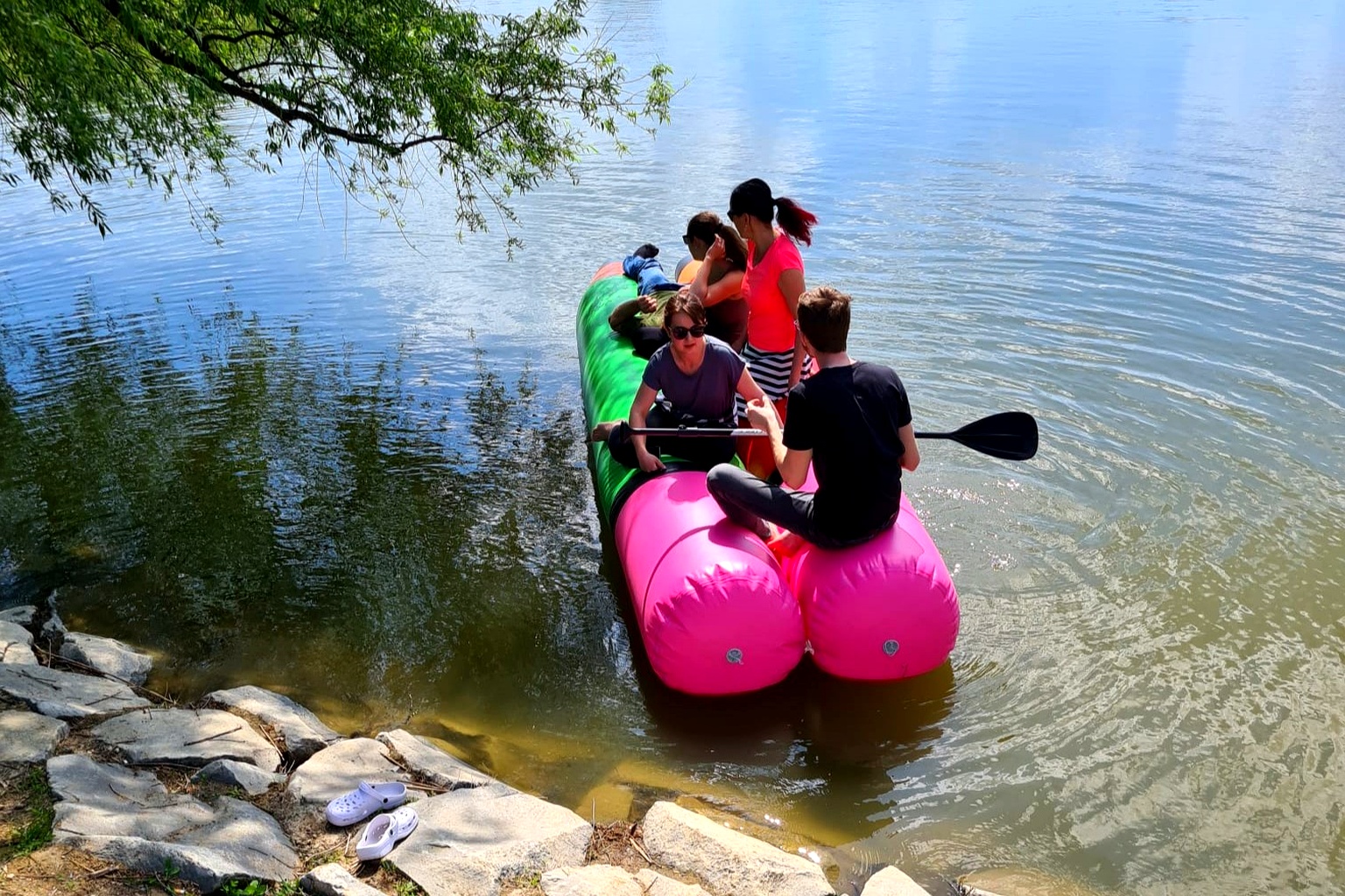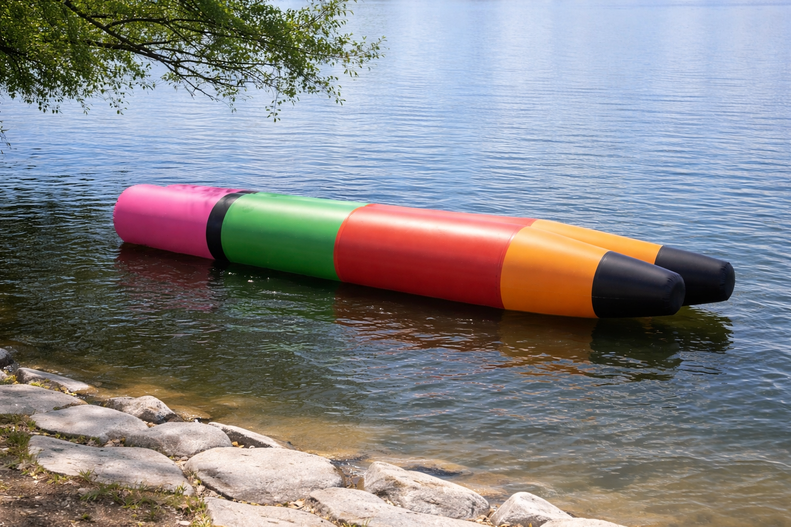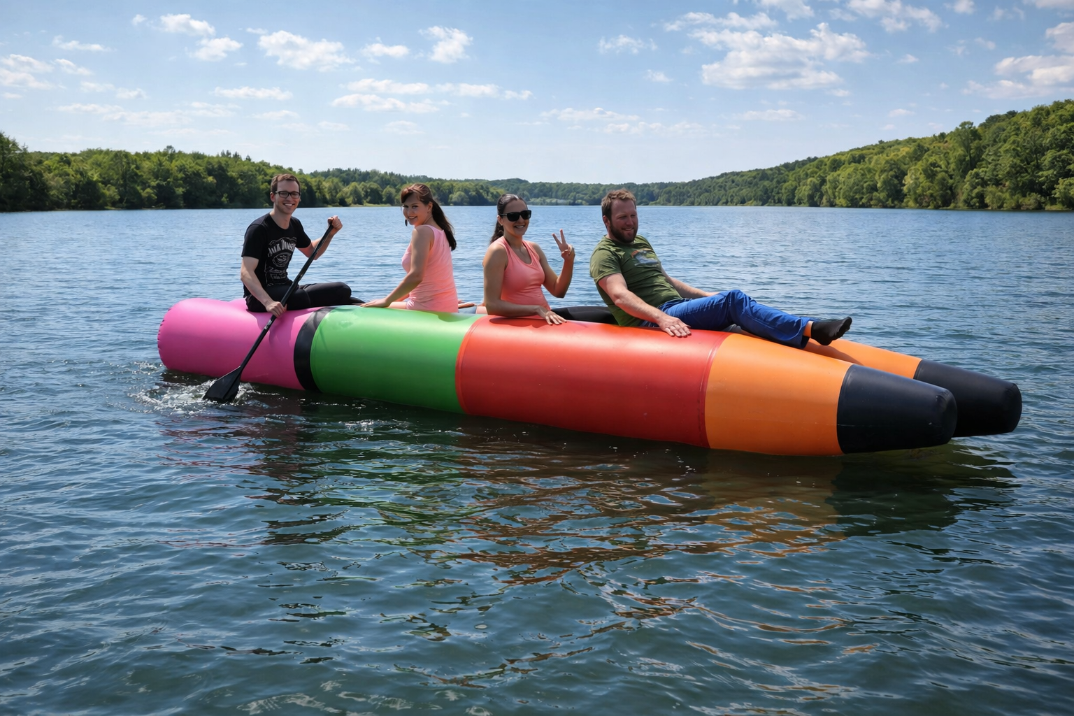 Originální nafukovací plavidlo tvořené dvěma pevně spojenými barevnými tubusy, které zaujme na první pohled a nabídne široké možnosti využití na vodě i na souši. Díky stabilní konstrukci je ideální pro zábavné aktivity na rybnících, jezerech nebo klidných vodních plochách, kde poslouží jako netradiční plavidlo pro více osob.