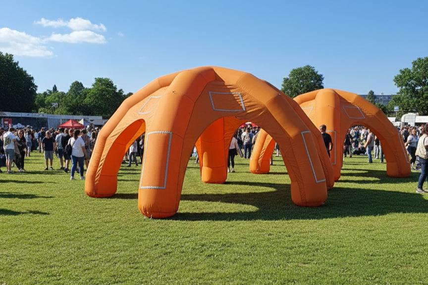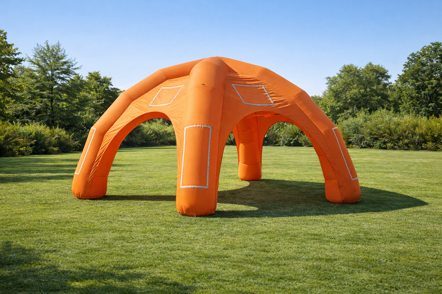 Originální nafukovací stan s výrazným designem, který na první pohled zaujme a vytvoří atraktivní zázemí na festivalech, sportovních akcích i firemních eventech. Otevřená konstrukce poskytuje dostatek prostoru a zároveň přirozené proudění vzduchu.